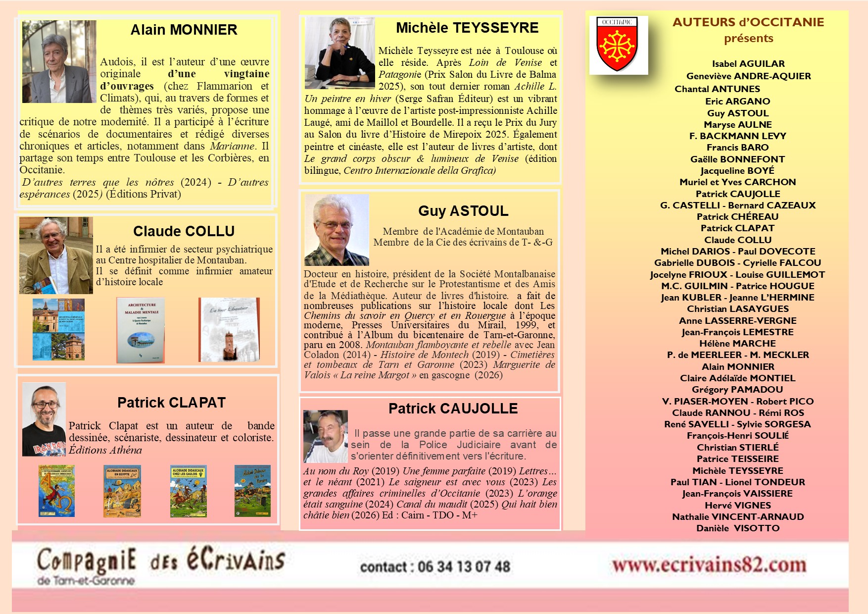 La Compagnie des écrivains de Tarn-et-Garonne vous donne rendez-vous le dimanche 19 avril 2026 pour la cinquième édition du Salon du livre de Montauban. De 10h à 18h, venez rencontrer des auteurs de la région Occitanie dont Patrice Teisseire-Dufour, Michèle Teysseyre, Alain Monnier et plein d'autres.