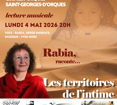 Le lundi 4 mai 2026 à 20h au café associatif C.R.A.Z.Y Orques, Salle Thomas Jefferson, à Saint-Georges-D’Orques retrouvez une lecture musicale de Les territoires de l’intime avec en voix Rabia, et Serge Narkats accompagné par Yves Gori pour la musique.