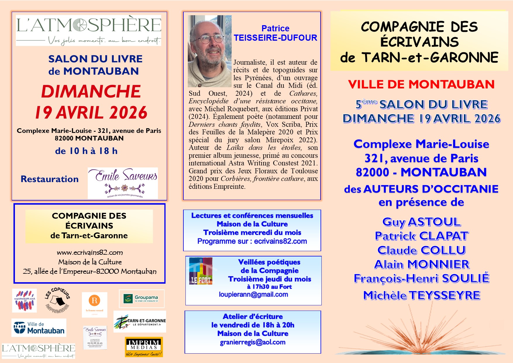 La Compagnie des écrivains de Tarn-et-Garonne vous donne rendez-vous le dimanche 19 avril 2026 pour la cinquième édition du Salon du livre de Montauban. De 10h à 18h, venez rencontrer des auteurs de la région Occitanie dont Patrice Teisseire-Dufour, Michèle Teysseyre, Alain Monnier et plein d'autres.